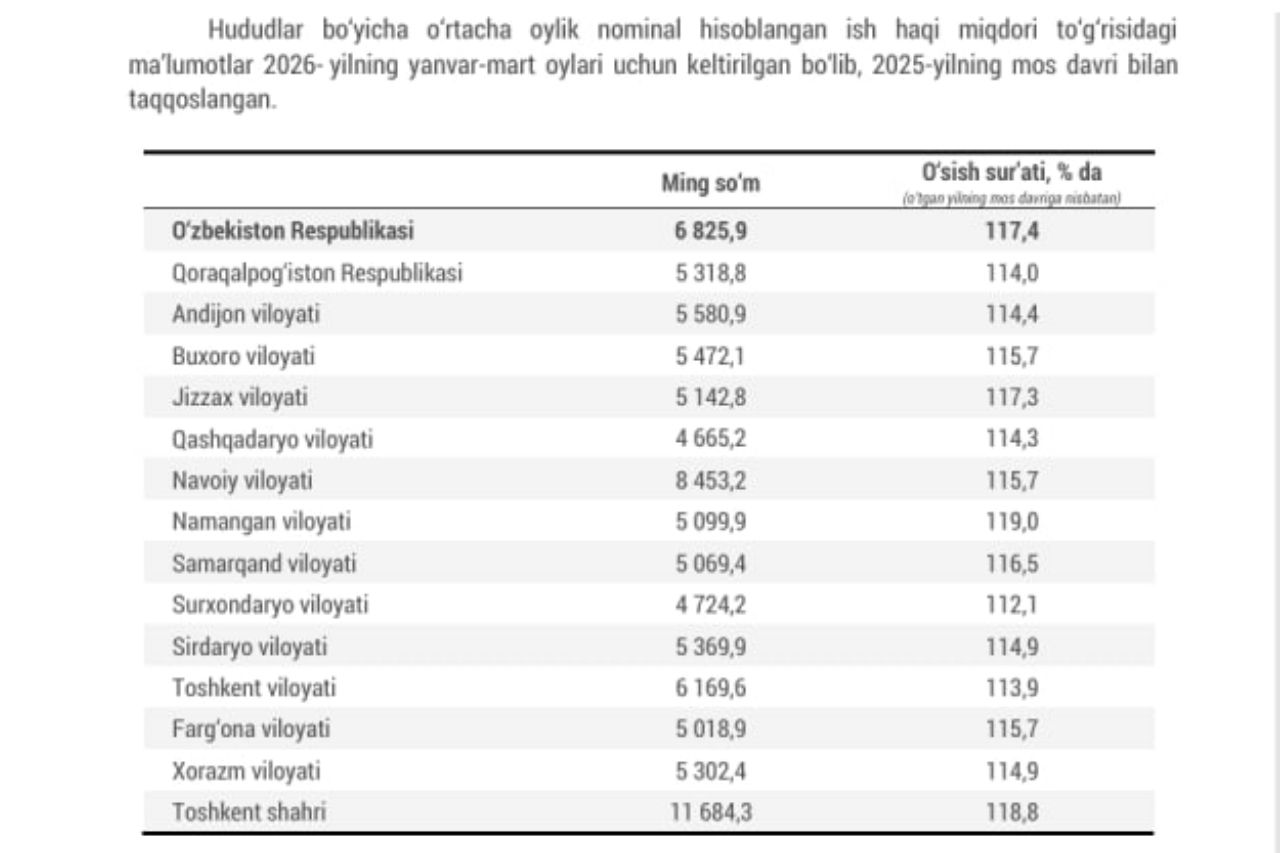 Статистика қўмитаси ҳисоботига кўра, 2026 йилнинг январь-март ойларида Ўзбекистонда ўртача ойлик номинал иш ҳақи 6,8 млн сўмдан ошди.