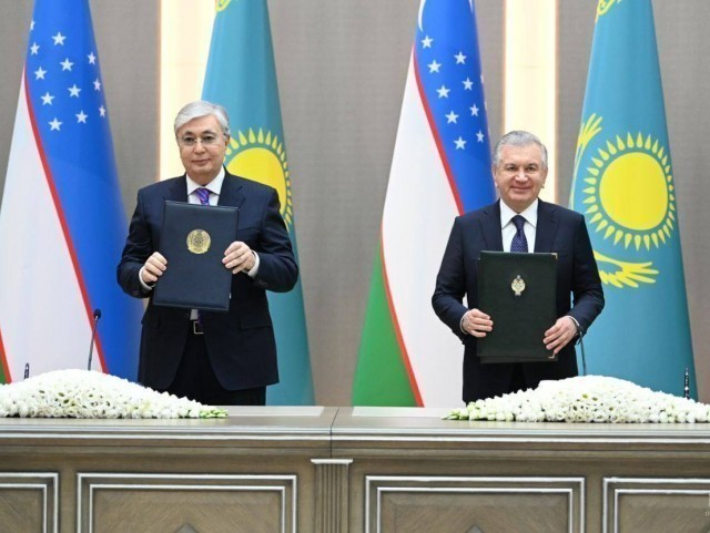 Ўзбекистон Президенти Шавкат Мирзиёев ва Қозоғистон Президенти Қосим-Жомарт Тўқаев тарихий ҳужжатлар – Иттифоқчилик муносабатларини ўрнатиш тўғрисида шартнома ва Ўзбекистон-Қозоғистон давлат чегарасини демаркация қилиш тўғрисида шартномани имзоладилар.