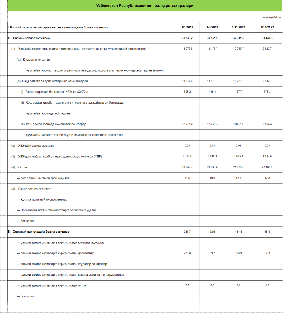 Ўзбекистон ялпи халқаро захиралари 2022 йил бошидан 1,70 миллиард долларга ёки 4,83 фоизга камайган. Бунда олтин нархининг йил бошидаги 1799,25 доллардан 1759,65 долларгача пасайишининг таъсири 0,51 миллиард долларни ташкил қилган.